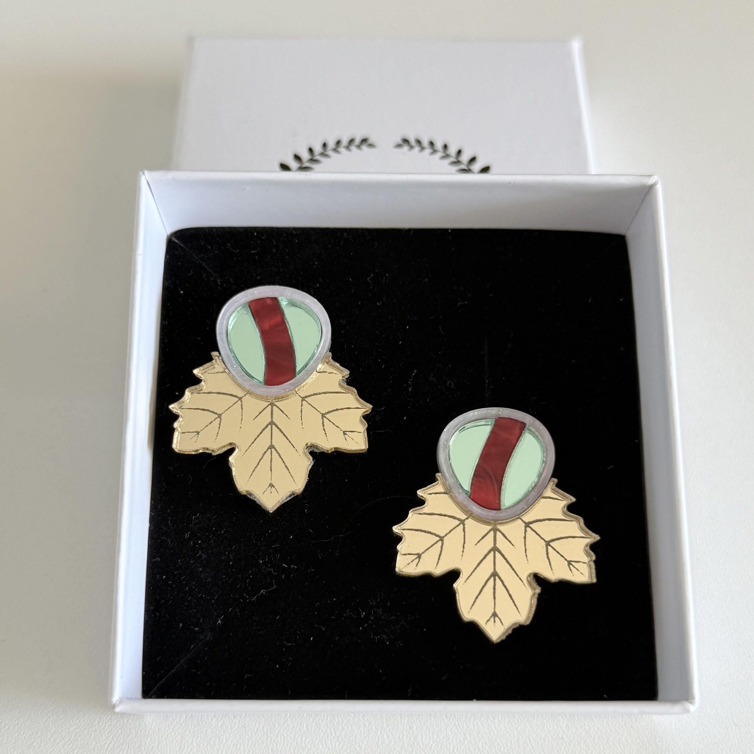 Colores:  Dorado espejo, blanco nácar, verde agua, rojo mármol.