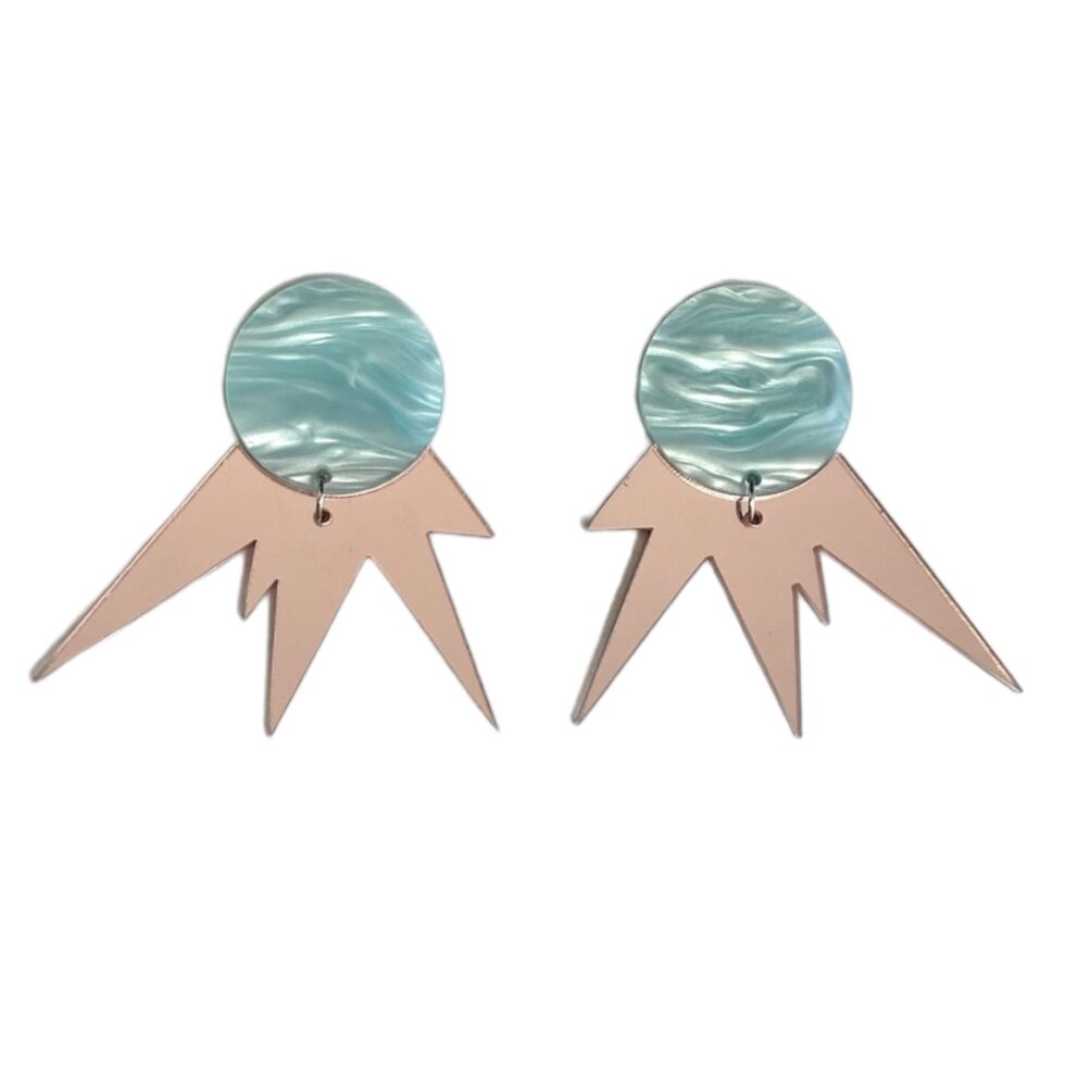 Pendiente de metacrilato azul nacarado y rosa esoejo.