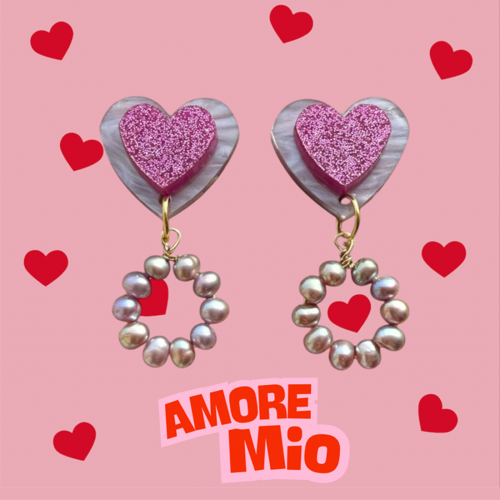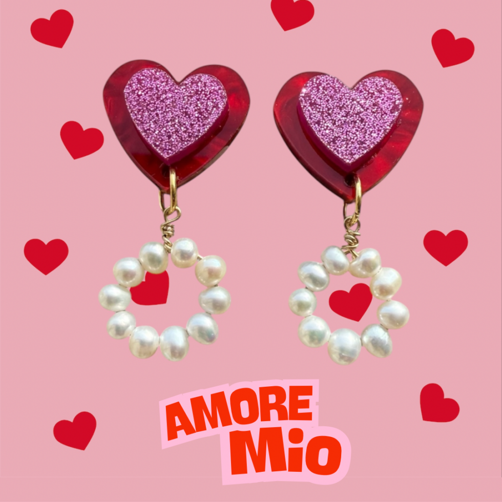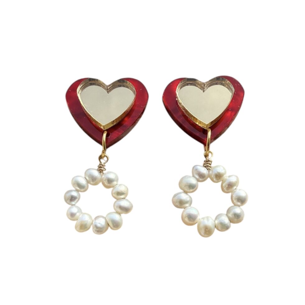 Colores: Opción 1: Corazón rojo nácar y dorado espejo con el detalle de perlas blancas de agua dulce. (NO ACRILICAS)