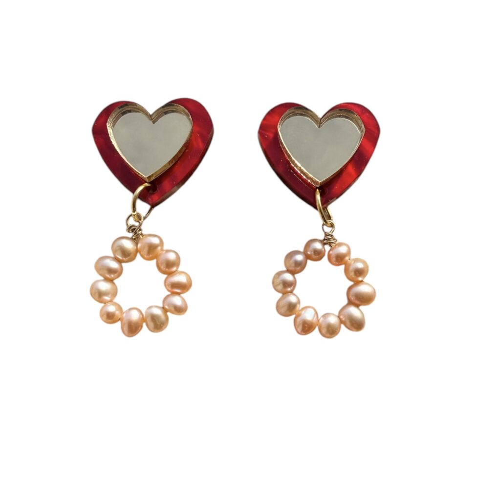 Opción 2: Corazón rojo nácar y dorado espejo con el detalle de perlas naranjas de agua dulce.
